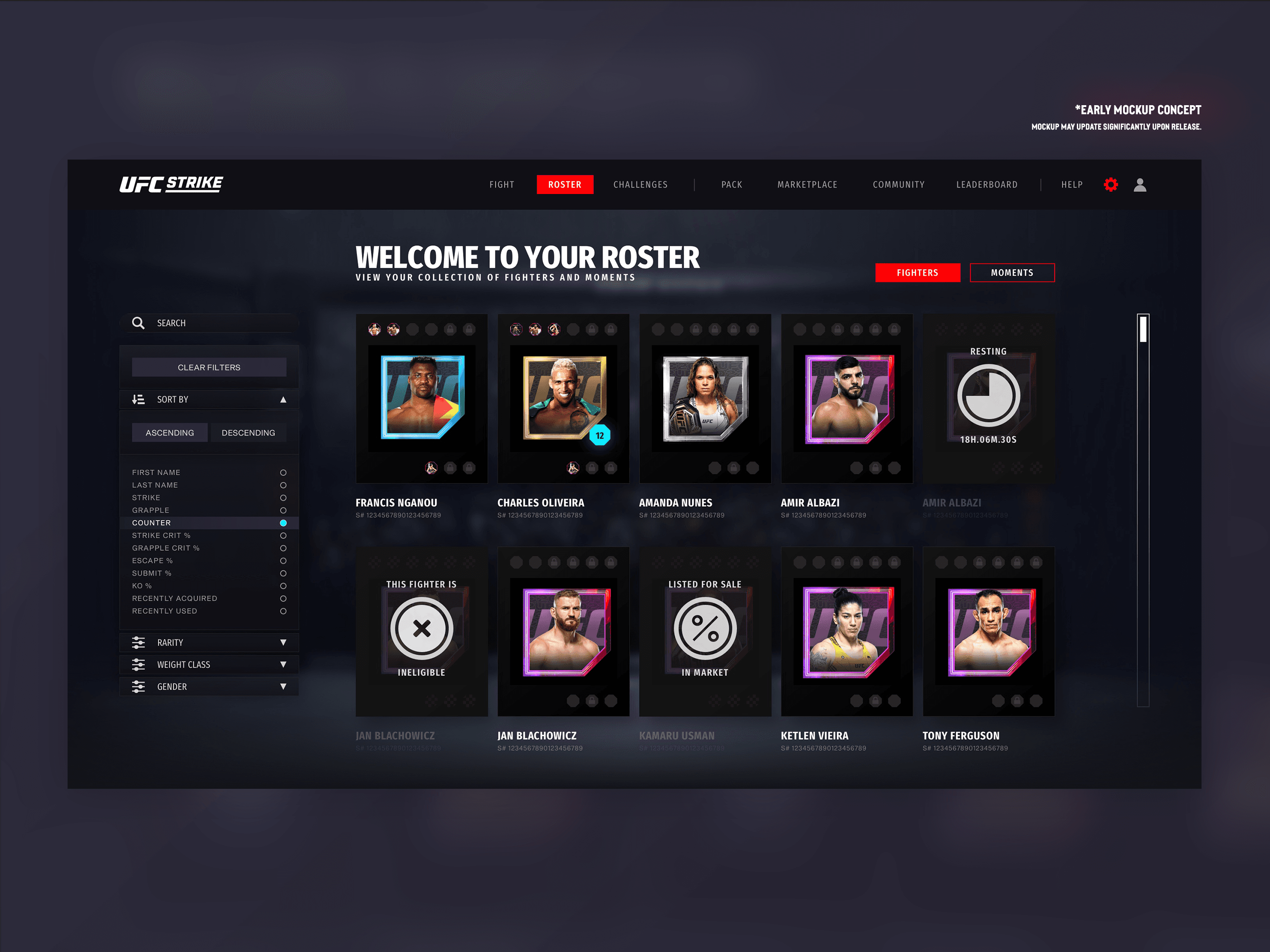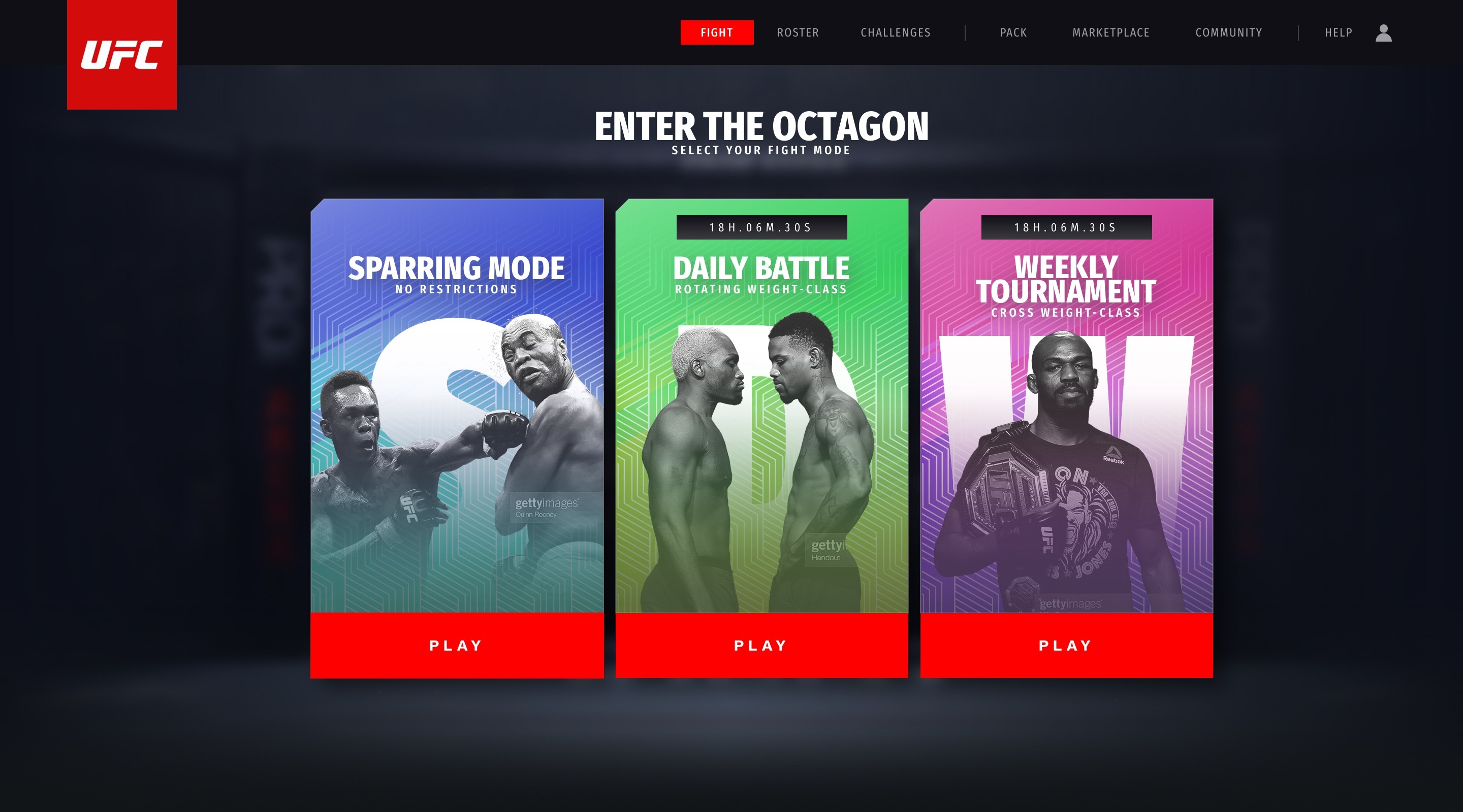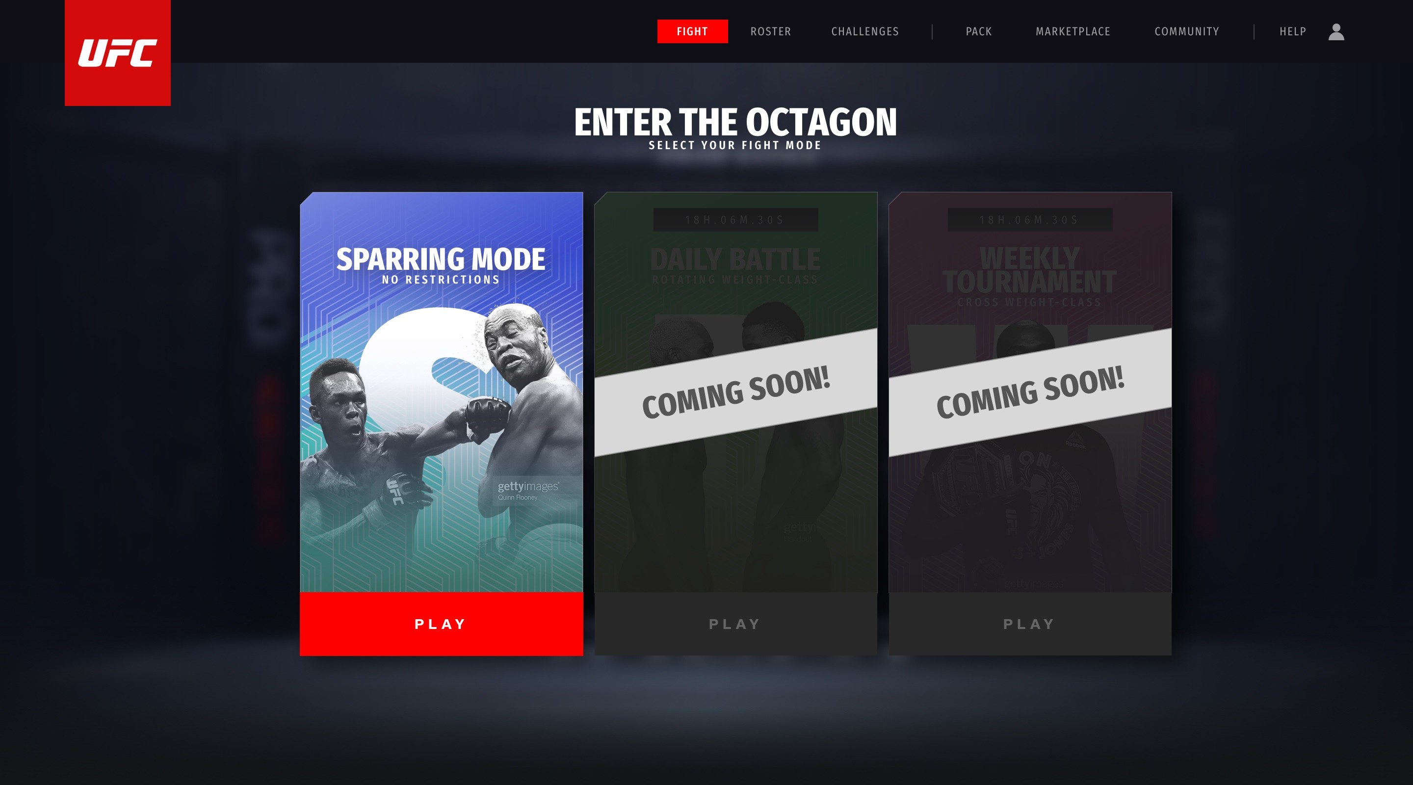 To kick off the project and generate early excitement, I designed a conceptual home page that captured the energy and potential of UFC Strike. This screen wasn’t intended as final production UI, instead it served as a visual north star to communicate the game’s direction, feature pillars, and aesthetic to internal stakeholders, marketing leads, and external partners. Using a mix of placeholder assets and rapid layout exploration, the goal was to convey what a player might feel upon entering the game: impact, energy, and a sense of collectible value rooted in UFC’s brand DNA.