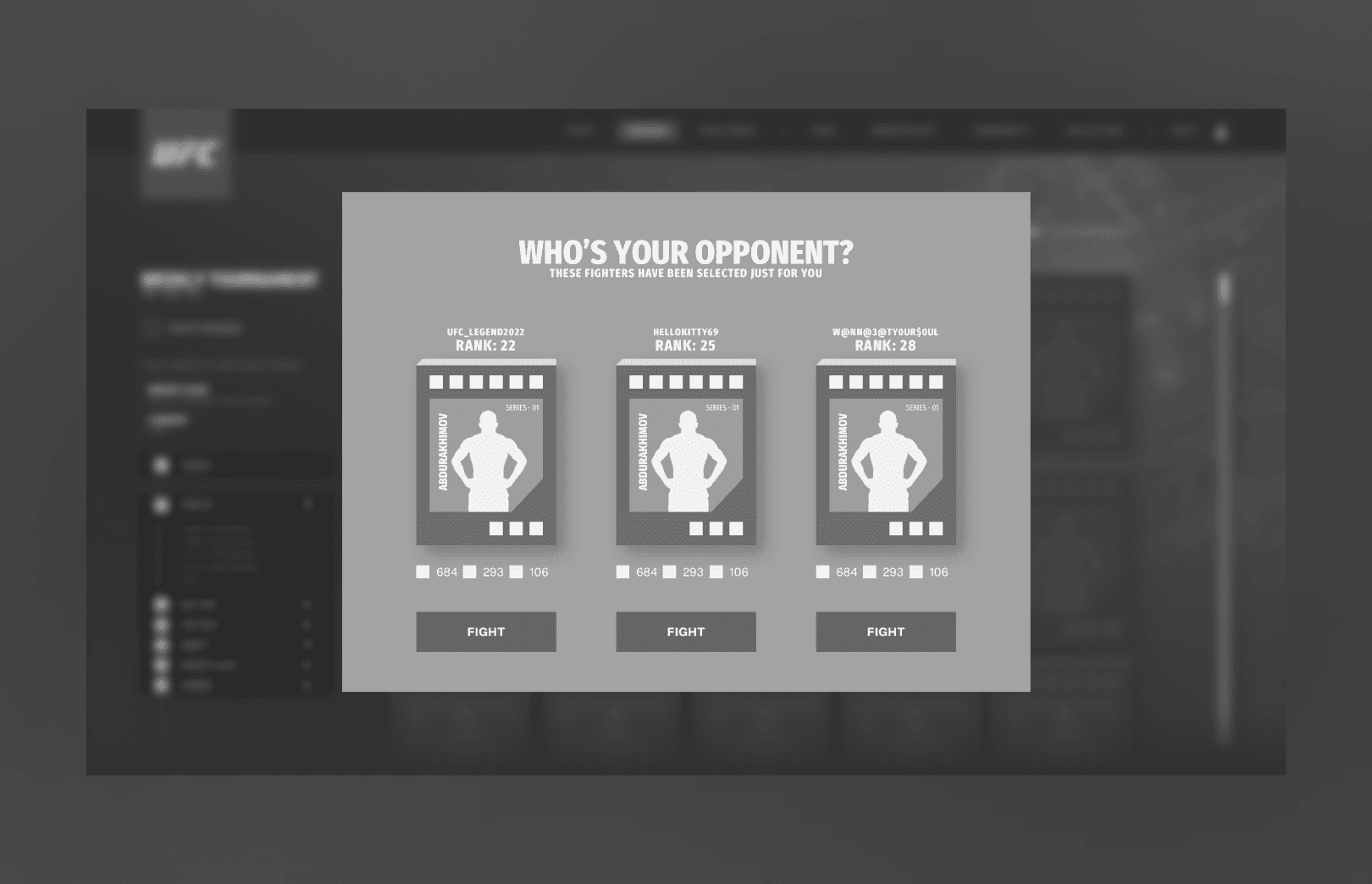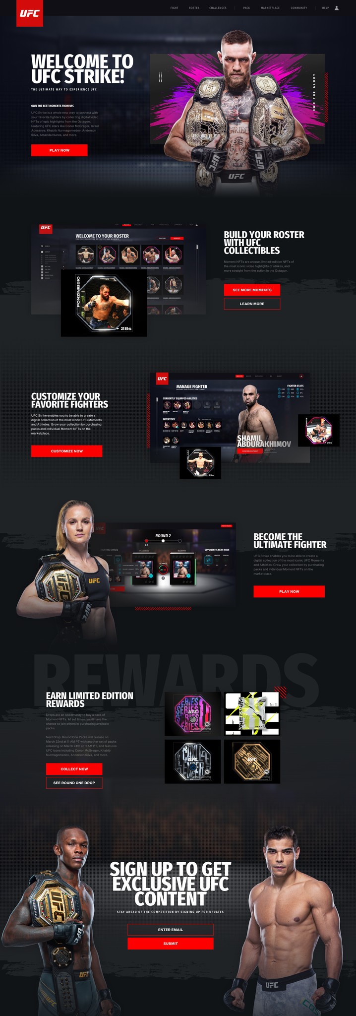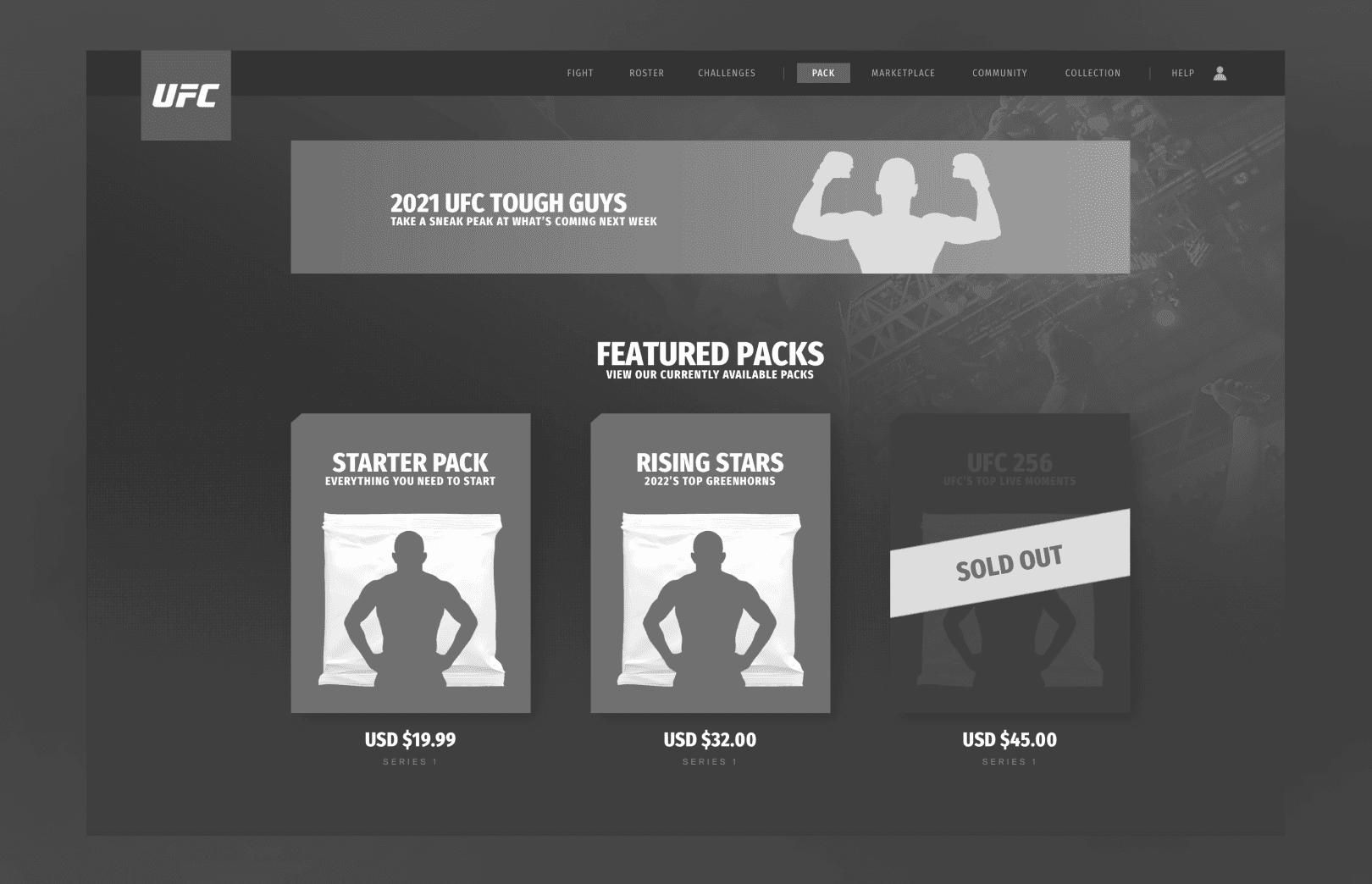 To kick off the project and generate early excitement, I designed a conceptual home page that captured the energy and potential of UFC Strike. This screen wasn’t intended as final production UI, instead it served as a visual north star to communicate the game’s direction, feature pillars, and aesthetic to internal stakeholders, marketing leads, and external partners. Using a mix of placeholder assets and rapid layout exploration, the goal was to convey what a player might feel upon entering the game: impact, energy, and a sense of collectible value rooted in UFC’s brand DNA.