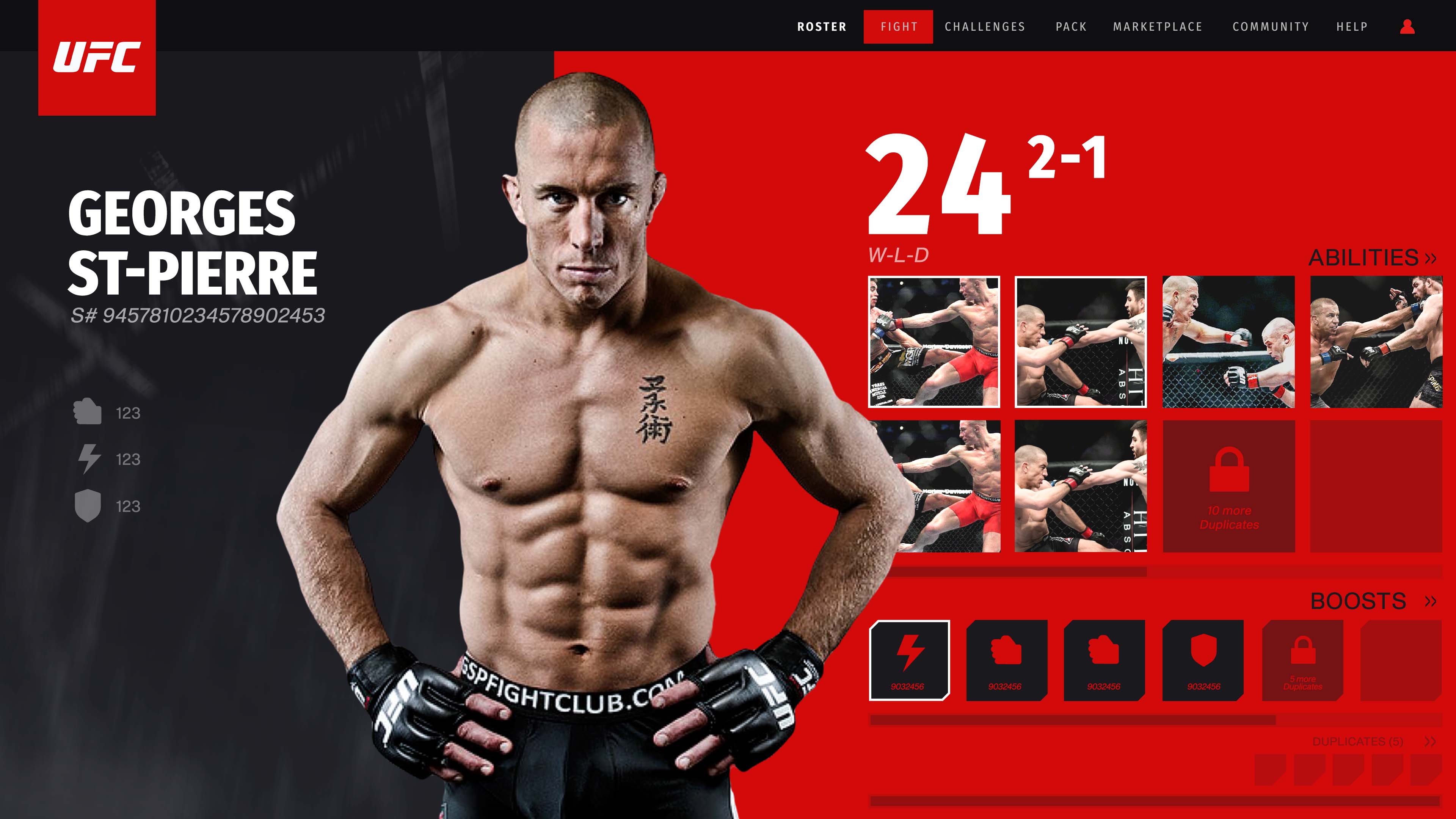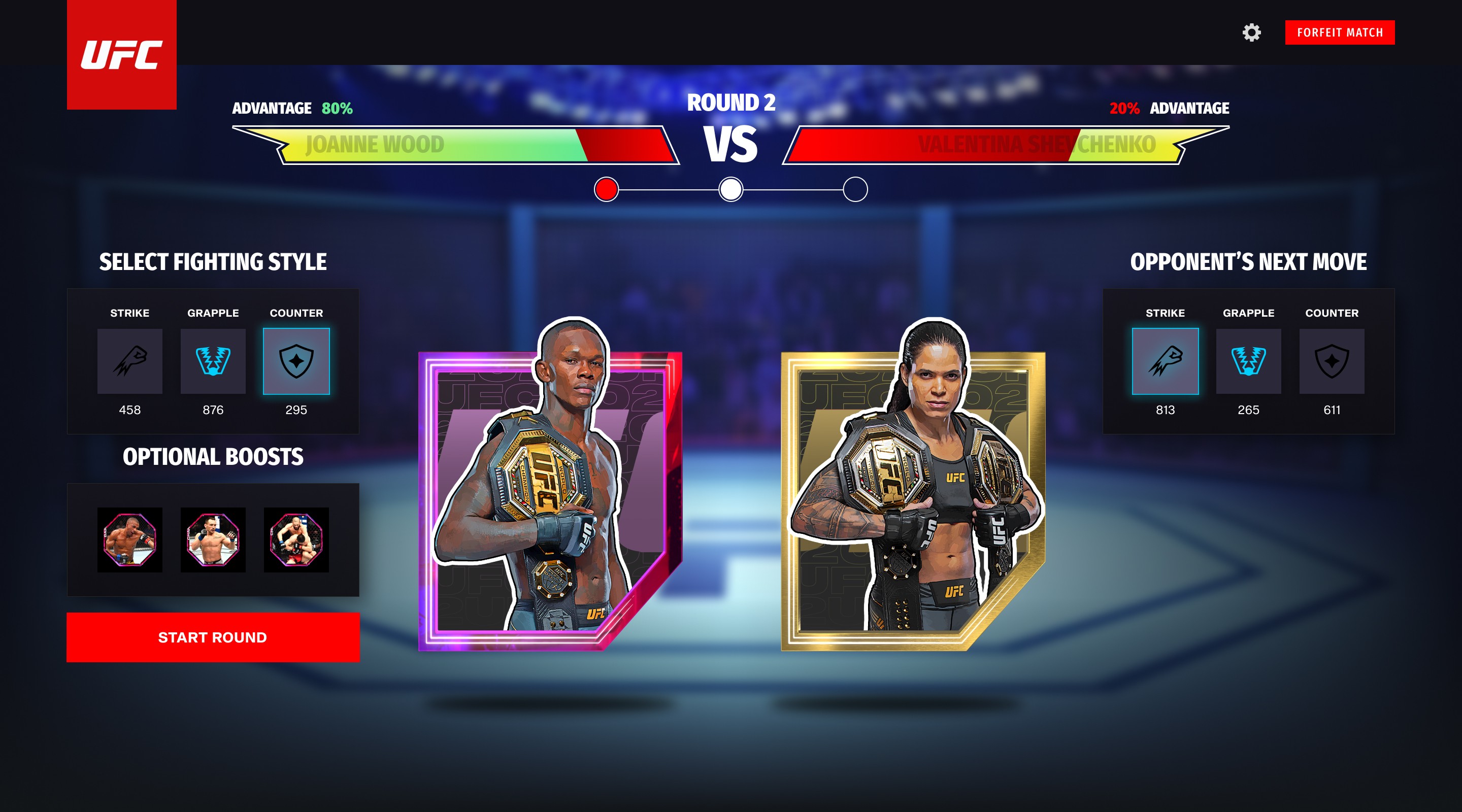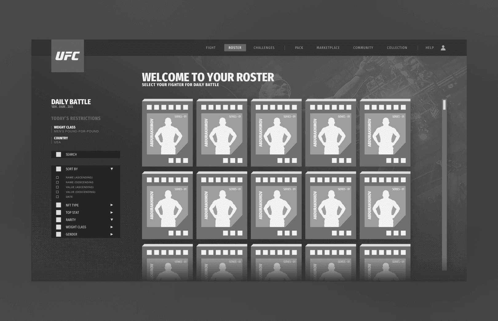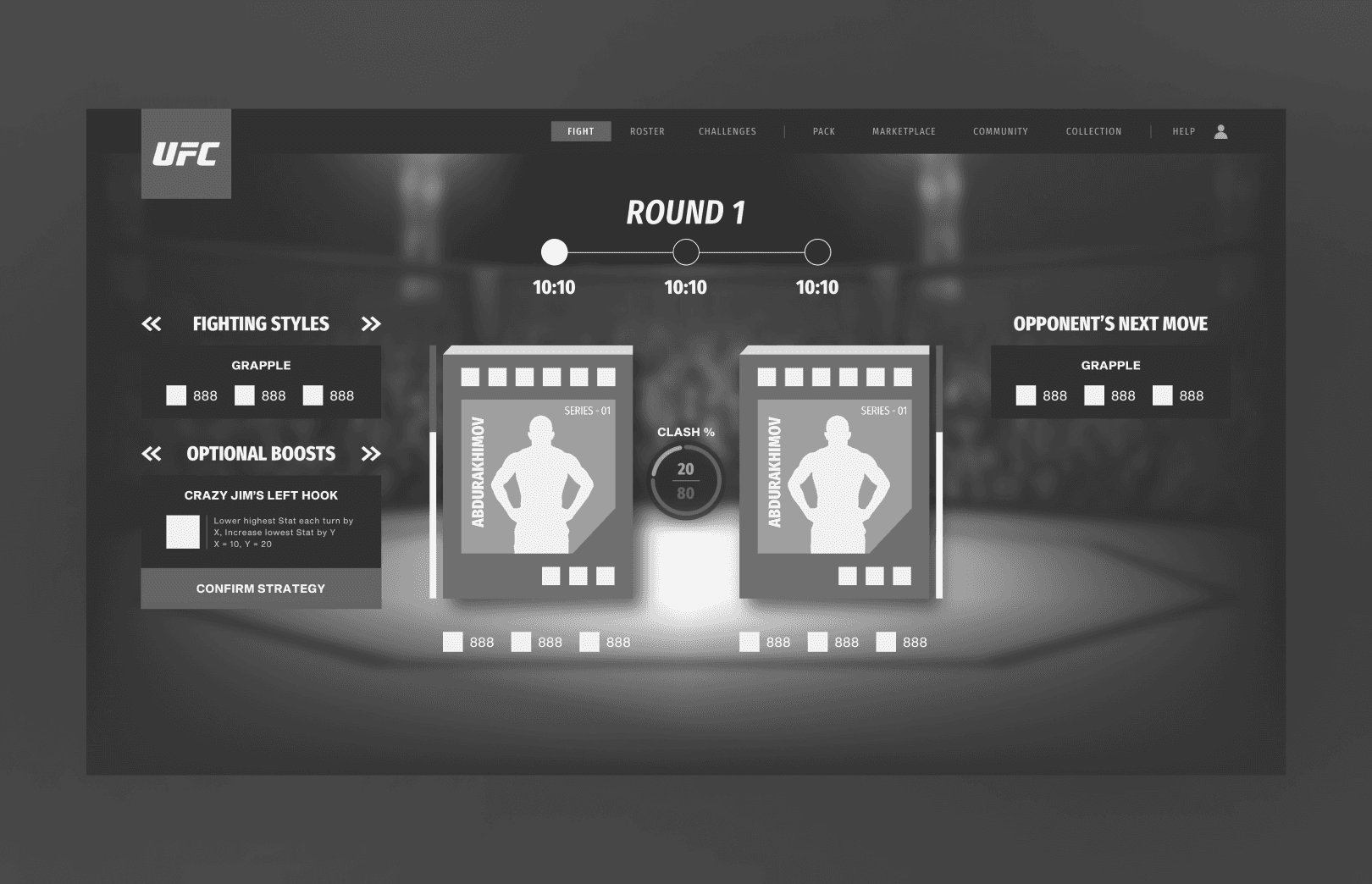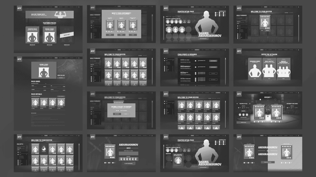 For a web-based NFT fighting game in partnership with UFC, blending collectible mechanics with intuitive game flows across roster, squad, and match systems.