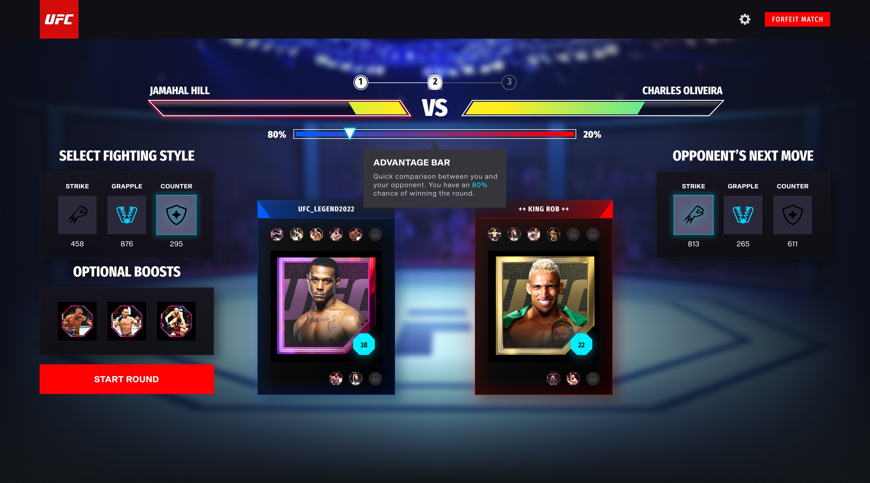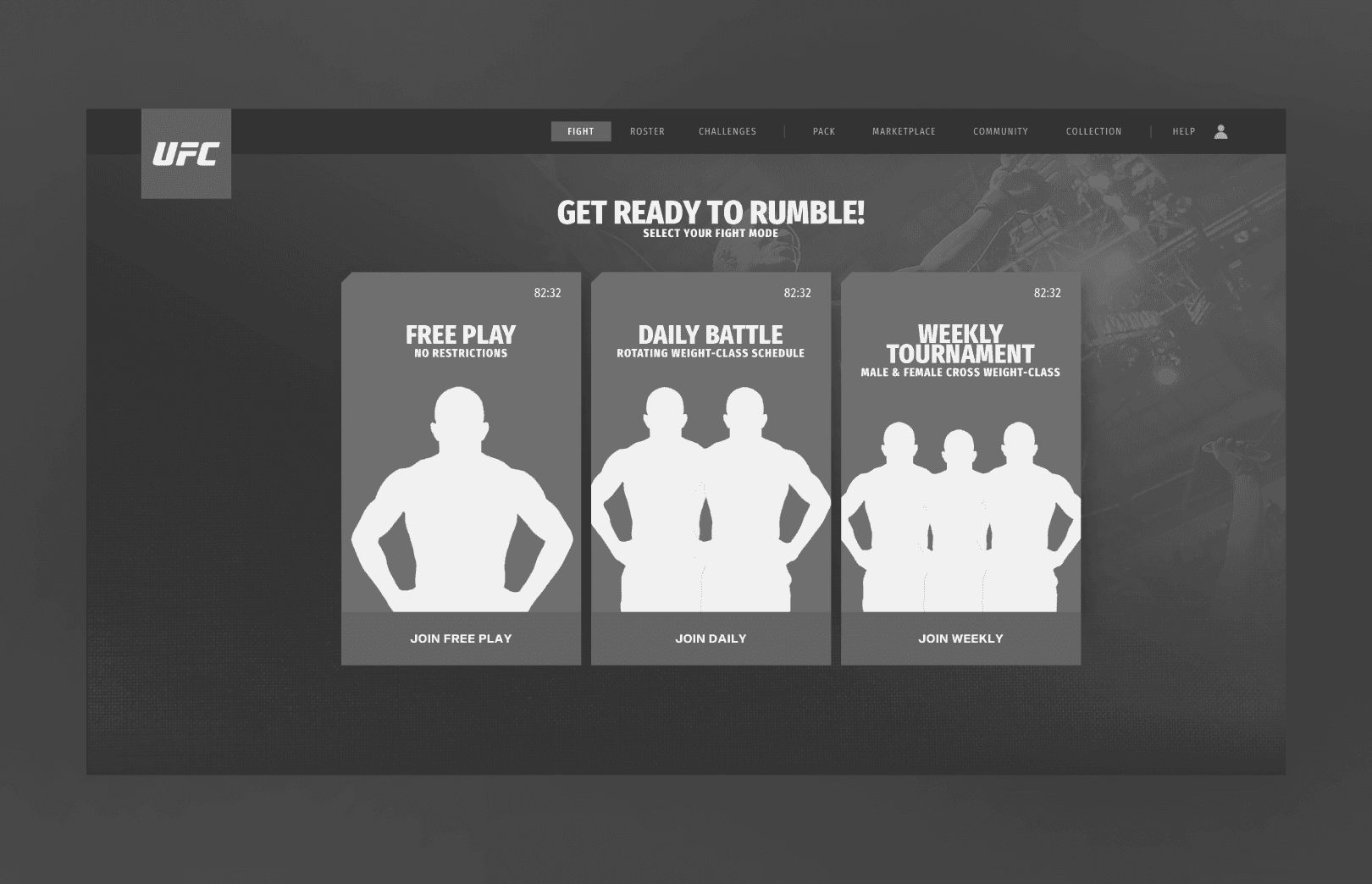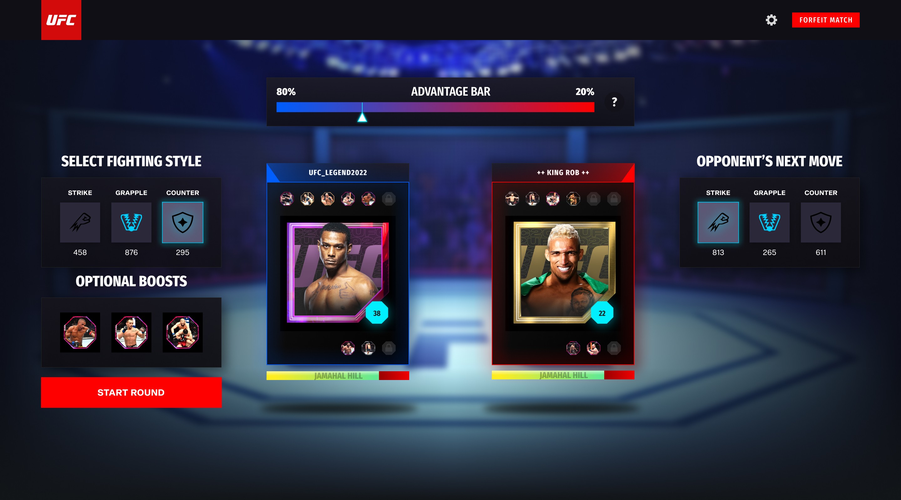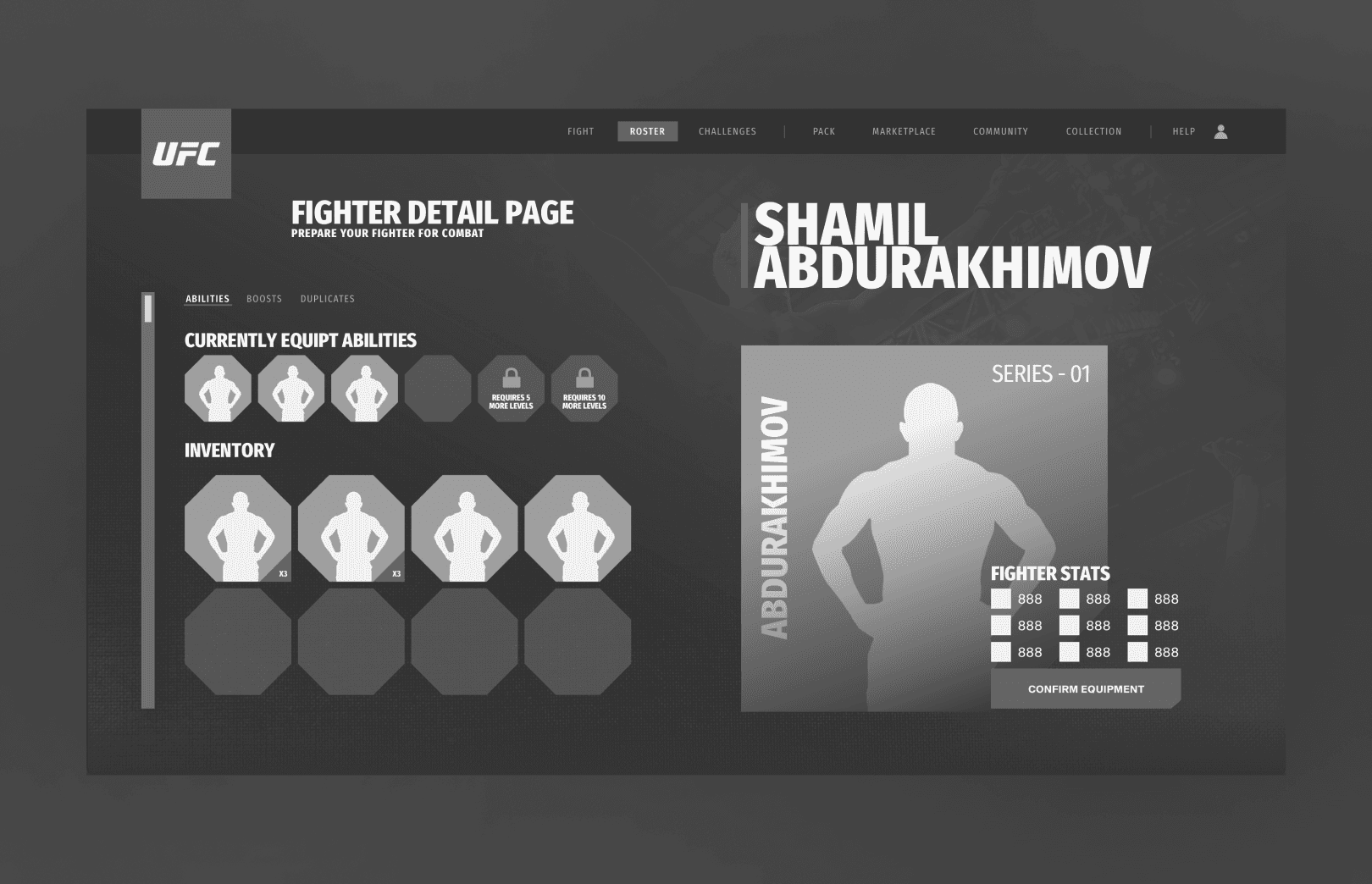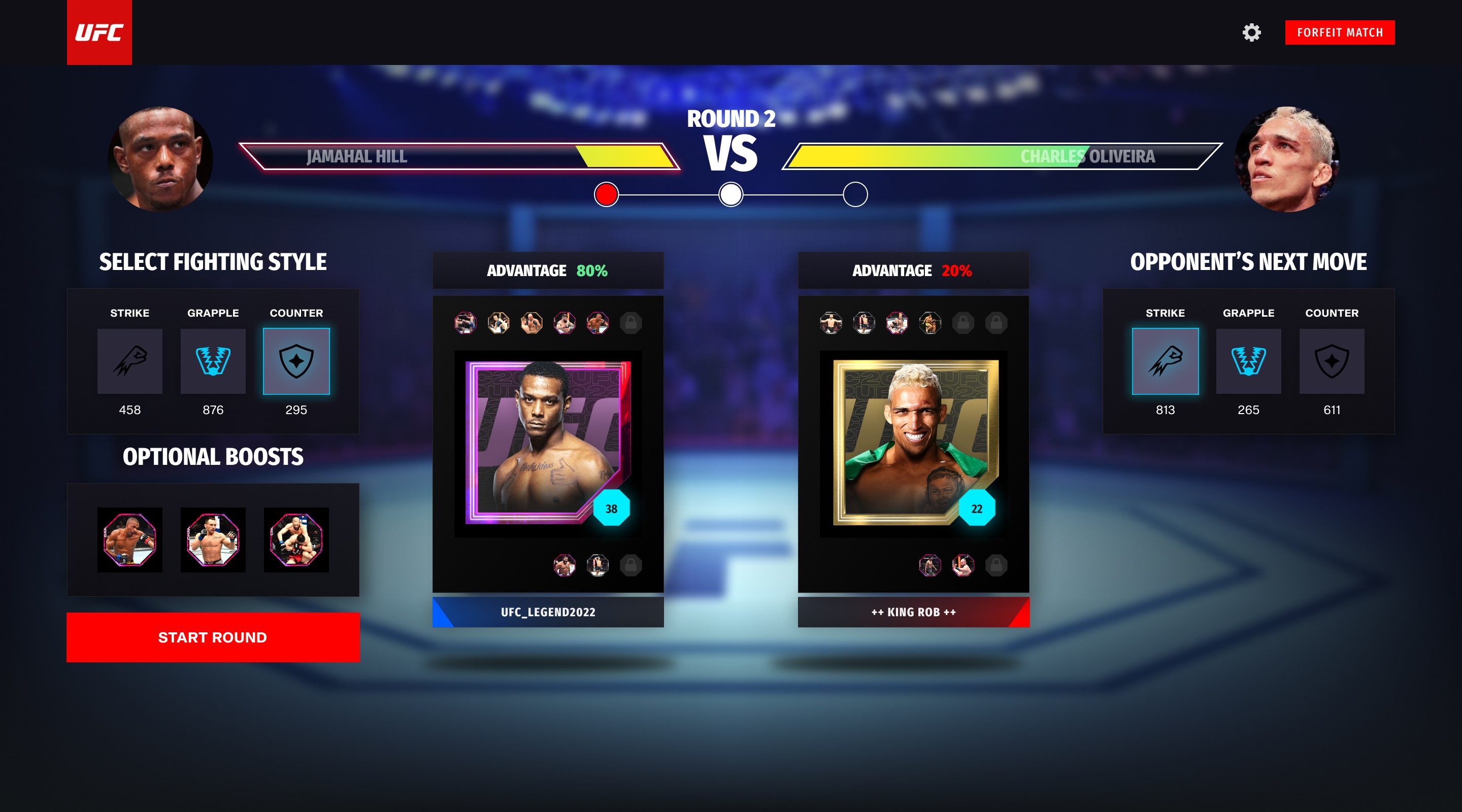 For a web-based NFT fighting game in partnership with UFC, blending collectible mechanics with intuitive game flows across roster, squad, and match systems.