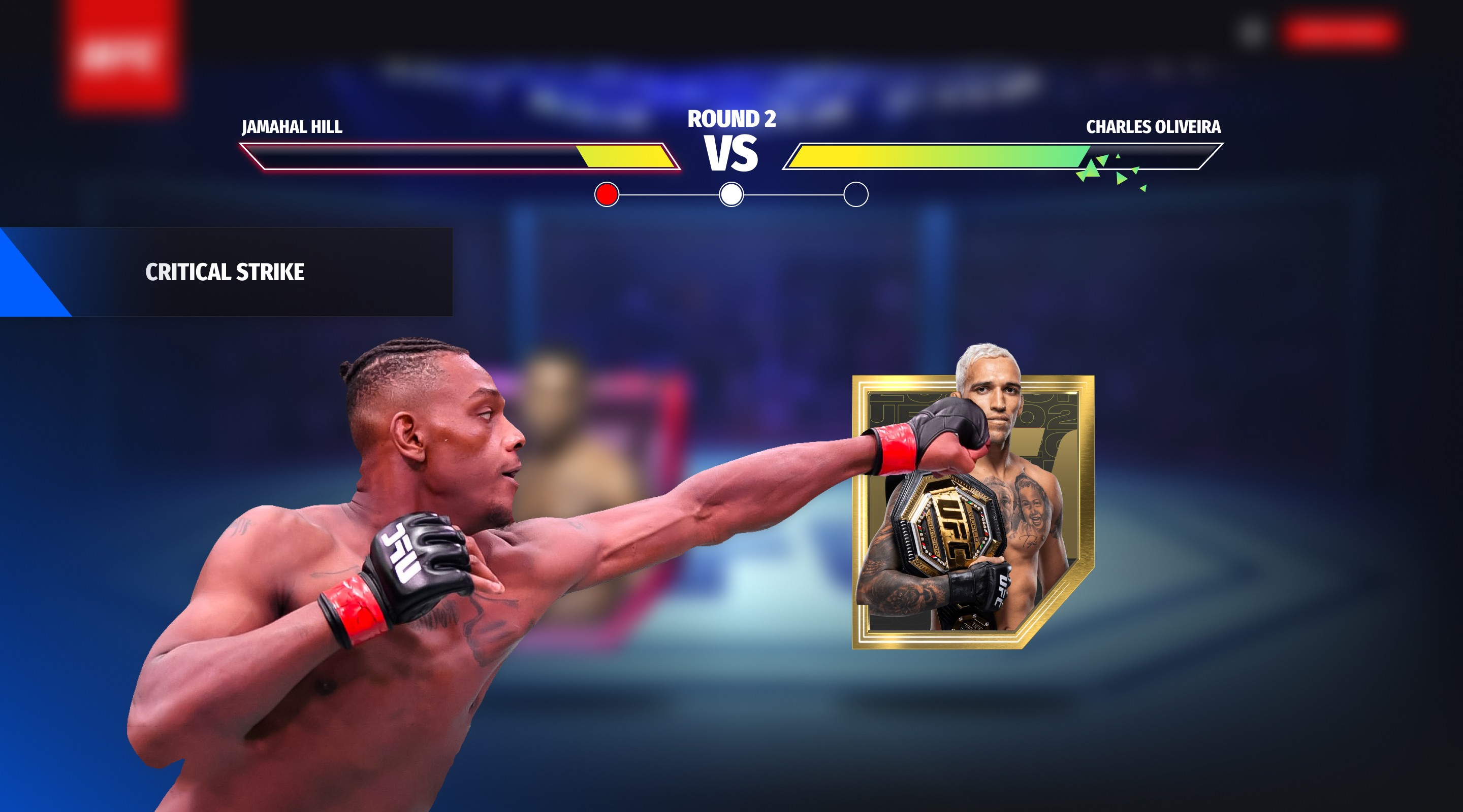 We experienced challenges early on determining how combat could be represented with the limited visual assets at our disposal. Due to licensing limitations, the team at UFC wasn’t fully solidified whether 3d renderings of these fighters would be displayed, or if these flat cards would be used instead. I undertook creating a “worst case/bare bones scenario”, communicating concepts on how some of the surrounding elements might transition in/out, and how combining sounds with colliding cards could represent the fight.